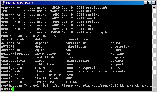 Once Mono has been downloaded, untar it wth tar -xzvf mono-2.10.8.tar.gz. The untar process will create a new directory called mono-2.10.8. Go into the directory via cd mono-2.10.8 and start the configuration process with this command: ./configure –prefix=/opt/mono-2.10 && make && make install This command compiles Mono and installs it in the /opt/mono-2.10 directory and will take approximately 20 minutes to complete.