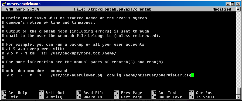 The last thing to do now is to add it to our crontab. It is important to know that Overviewer is an incremental generator meaning that it will only render/rerender chunks that have changed since the last run. If you are using an existing world, you will notice that your first render takes a long time, but subsequent renders (provided that you don’t purge the destination directory) are very fast. That being said, we need to ensure that there is enough time between the first command (renderer) and the second command (generate POIs) to allow the renderer to finish. I recommend anywhere between 30 minutes and an hour between runs. Use crontab -e as your mcserver user and copy the first command we added earlier, this time changing the first number from 0 to 30. This will kick off the POI generator 30 minutes after midnight. By then the render should be completed. Below is what your crontab should look like with both commands entered.