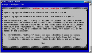 This command will install several packages including the Sun Java6 runtime environment which is required for running Minecraft. During the installation, you will get a prompt which looks like the below. Be sure to accept the license otherwise Java will not be installed. Please note: The weird characters are due to the fact I am using PuTTY in a Windows box. Although the text may not render properly, the functionality is the same. Just scroll down using the Page Down key, hit Tab, then Enter to go to the next screen
